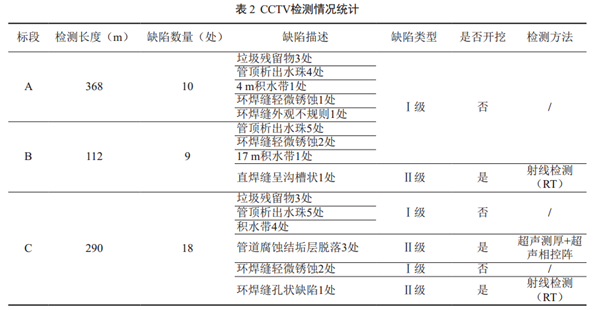 查詢相關(guān)規(guī)范,未查到長輸油氣管道CCTV檢測相關(guān)缺陷評(píng)級(jí)依據(jù)。結(jié)合相關(guān)項(xiàng)目經(jīng)驗(yàn),企業(yè)內(nèi)部討論得出關(guān)于CCTV檢測缺陷分級(jí)標(biāo)準(zhǔn),缺陷分成兩個(gè)等級(jí),Ⅰ級(jí)缺陷是指管內(nèi)垃圾殘留、管頂析出水珠、管底積水、焊縫輕微銹蝕等不需要開挖驗(yàn)證的缺陷;Ⅱ級(jí)缺陷是指可能對管道本體結(jié)構(gòu)造成影響的直焊縫、環(huán)焊縫、腐蝕分層脫落等需要開挖驗(yàn)證的缺陷。檢測情況統(tǒng)計(jì)見表 2。