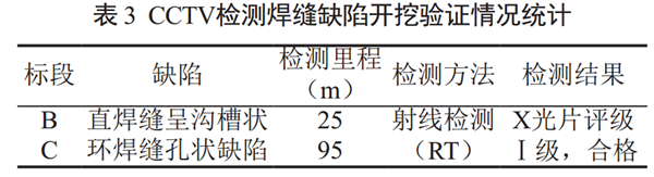 按照管道完整性閉環(huán)管理要求,結(jié)合缺陷類型和嚴(yán)重程度,選取有針對性的檢測方法進(jìn)行開挖驗(yàn)證,焊縫缺陷開挖驗(yàn)證情況見表 3。