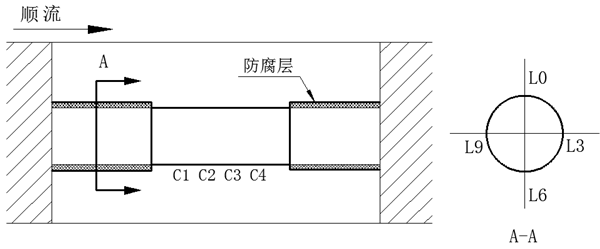 評(píng)定為Ⅱ級(jí)的3處管道腐蝕結(jié)垢層脫落缺陷, 2處具備開挖條件,分別位于檢測里程119 m和125 m處,現(xiàn)場開挖選取長約1 m的檢測管段,采用超聲相控陣檢測未發(fā)現(xiàn)缺陷點(diǎn),采用超聲測厚儀對管道剩余壁厚進(jìn)行測試,檢測里程119 m處、 125 m處管段最小壁厚分別為18.45 mm、 18.75 mm,測厚點(diǎn)部位見圖 4,詳細(xì)測試數(shù)據(jù)見表 4。