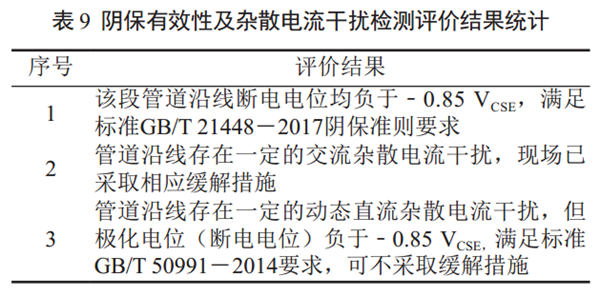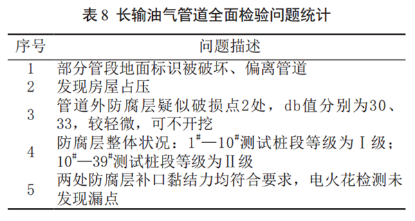 參照SY/T 0087.1―2006《鋼質(zhì)管道及儲(chǔ)罐腐蝕評(píng)價(jià)標(biāo)準(zhǔn)埋地鋼質(zhì)管道外腐蝕直接評(píng)價(jià)》 TSG 7003―2010《壓力管道定期檢驗(yàn)規(guī)則―長輸(油氣)管道》,對該段管道開展全面檢驗(yàn),并出具合于使用評(píng)價(jià)報(bào)告,檢測結(jié)果見表 8。