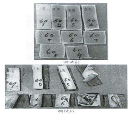分析原因: 1號(hào)試件的敷膜層為改性PVC,與滌綸纖維之間的親和力要好于敷膜層為改性PE的試件;在開(kāi)放條件下四周熱水不規(guī)則地侵蝕質(zhì)量標(biāo)準(zhǔn)難統(tǒng)一的試件也是造成敷膜層與編織層剝離的因素;改性PE材料熱穩(wěn)定性差,熱膨脹比大也是因素之一。