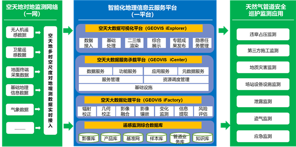 管道空天地一體化智能巡檢系統(tǒng)是構(gòu)建“一網(wǎng)、一平臺(tái)”的遙感信息服務(wù)模式,實(shí)時(shí)接入空、天、地融合的多時(shí)空尺度觀測(cè)數(shù)據(jù),以智能化地理信息云服務(wù)平臺(tái)為核心,形成面向線路安全巡檢的應(yīng)用系統(tǒng)。系統(tǒng)架構(gòu)如圖 1所示。