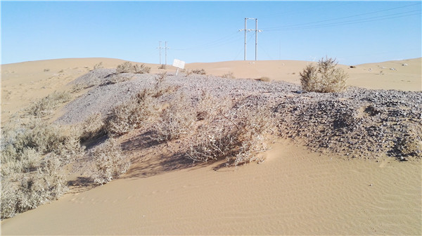 圖 1 騰格里沙漠管道周邊扎草方格固沙治理3年效果