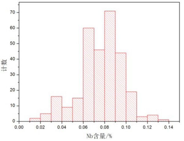 圖 3 X80鋼管的Nb含量分布統(tǒng)計