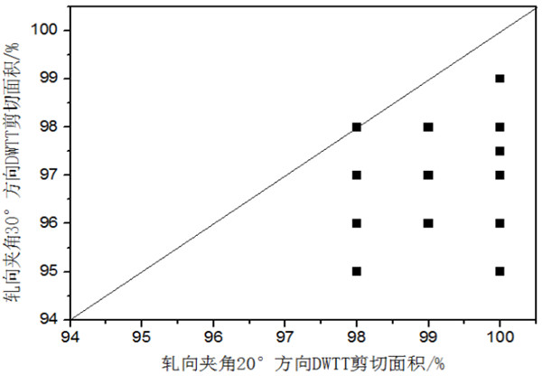 圖 5 熱軋板卷20°和30°位置的DWTT結(jié)果對比
