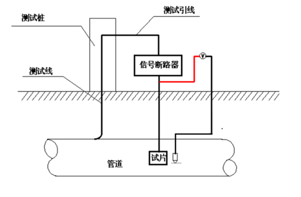 為驗證IR降大小與通電電位的關(guān)系,通過極化試片法對地鐵附近管道監(jiān)測數(shù)據(jù)進(jìn)行了對比分析,極化試片法的測試接線如圖 1所示,通過信號斷路器的中斷,可以測試與管道連接的試片的通/斷電位。