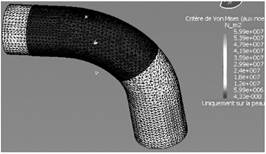 經(jīng)有關(guān)部門研究, 采用凱夫拉纖維復(fù)合材料補(bǔ)強(qiáng)技術(shù)對(duì)此段管道進(jìn)行修復(fù)。 補(bǔ)強(qiáng)方案確立后, 經(jīng)過(guò)耐斯管道公司軟件分析, 計(jì)算管道缺陷的相關(guān)數(shù)據(jù)信息, 確定了補(bǔ)強(qiáng)修復(fù)的產(chǎn)品類型和方式。 首先對(duì)無(wú)缺陷管道承受內(nèi)壓時(shí)管壁應(yīng)力分布進(jìn)行計(jì)算。 在管道完好無(wú)損情況下, 承受11MPa的內(nèi)壓時(shí), 建立3D模型對(duì)該方案進(jìn)行分析。 在3D模型中, 鋼材的彈性模量取207GPa, 泊松比為0.3, 屈服強(qiáng)度為450MPa。 管道內(nèi)的運(yùn)行壓力設(shè)定為11MPa, 凱夫拉纖維復(fù)合材料補(bǔ)強(qiáng)層數(shù)為26層。