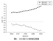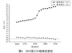 以新疆某油田一條輸氣管道為例, 在使用手動中斷法進行斷電電位測試時, 發(fā)現從205#樁至末站之間管道通電電位負于-850mv, 而斷電電位遠未達到-850mv, 圖4為205#至233#樁電位變化, 說明這段管道未處于陰極保護系統(tǒng)有效保護。