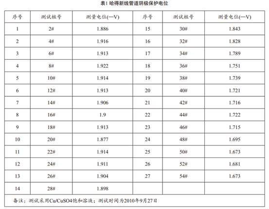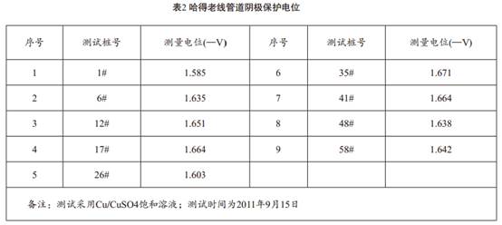服役初期哈得輸油新老線陰極保護系統(tǒng)運行均正常,但從2004年起哈得新線陰極保護系統(tǒng)出現(xiàn)異常,分別上調(diào)兩座陰保站恒電位儀輸出,但全線陰極保護電位仍處于較負狀態(tài),全線管道陰極保護電位逐步偏負,管道上陰極保護電位比恒電位儀輸出電位還負,最終停運全線兩座陰保站,但管道陰極保護電位仍達-1.8至-2.0v,數(shù)據(jù)見表1。哈得老線陰極保護系統(tǒng)于2009年出現(xiàn)同哈得新線相同現(xiàn)象,管道陰極保護電位仍達-1.5至-1.6v,數(shù)據(jù)見表2。