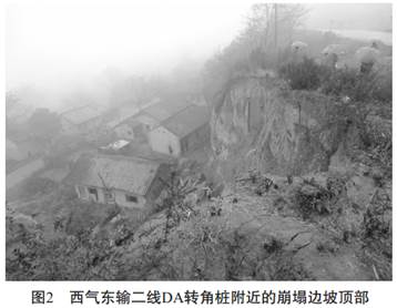 黃土組成陡立邊坡(坡角>45°) , 在重力及外力(如暴雨、 地震、 振動(dòng)等) 作用下, 發(fā)生突然地土體崩落, 崩塌過(guò)程中土體發(fā)生傾倒、 翻滾、 跳躍、 相互碰撞, 最后崩塌的土體結(jié)構(gòu)遭到破壞并散落堆積于坡腳。 圖2、 圖3為西氣東輸二線管道DA115轉(zhuǎn)角樁附近的邊坡崩塌, 管道自照片右上角穿越S306公路后, 自坡頂轉(zhuǎn)角并平行與公路敷設(shè)。 管道距離陡崖僅4m, 陡崖高達(dá)20余m, 由老黃土組成,垂直節(jié)理發(fā)育且處于不穩(wěn)定狀態(tài), 陡坎下方為農(nóng)居房屋, 由于降雨及公路路面匯水下滲, 邊坡發(fā)生崩塌情況, 已危及到房舍并對(duì)管道安全產(chǎn)生威脅。