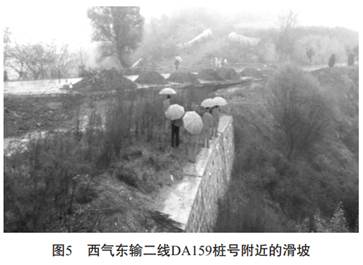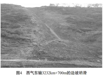 圖4為西氣東輸管道3232km+700m里程處的邊坡坍滑體, 管道沿60~70m高的山坡鋪設(shè), 埋深2.4m, 回填土為當(dāng)?shù)氐狞S土狀土, 土質(zhì)松散,雨水浸泡后產(chǎn)生坍滑, 將坡腳擋墻擠毀并越頂堆積于前緣, 致使管道外露并形成危害。