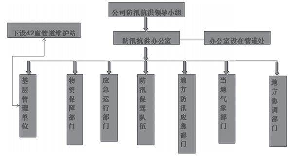 公司成立以生產(chǎn)主管副總經(jīng)理為組長, 相關(guān)部門主要領(lǐng)導(dǎo)為成員的防汛工作領(lǐng)導(dǎo)小組。 防汛領(lǐng)導(dǎo)小組辦公室設(shè)在管道處, 負責(zé)防汛工作的日常管理和信息匯總、 傳遞等工作。