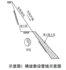 長(zhǎng)輸管道經(jīng)過(guò)地形起伏較大的邊坡, 橫坡敷設(shè)通過(guò)坡面時(shí), 坡面下部的填方段是最易遭受水力沖刷侵蝕的部位, 在坡面徑流的沖刷下, 堆積體極易發(fā)生水土流失, 一旦填方段的回填土體被沖刷殆盡, 會(huì)造成管線側(cè)壁薄弱, 嚴(yán)重時(shí)會(huì)造成長(zhǎng)距離露管, 如果牽動(dòng)坡體, 發(fā)生滑坡, 將有折斷管線的風(fēng)險(xiǎn)(示意圖1) 。