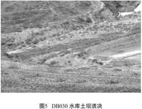 在管道穿越河溝道和河灘地內(nèi)采砂, 或者在管道附近進(jìn)行采石, 水土流失速度加劇, 更易造成管線露管或者漂管(圖4) 。 當(dāng)管道經(jīng)過(guò)地附近有農(nóng)村水利設(shè)施, 如因水利工程管理不善造成大壩潰堤, 洪水沖刷水土流失, 將造成露管甚至有折斷管道的可能(圖5) 。