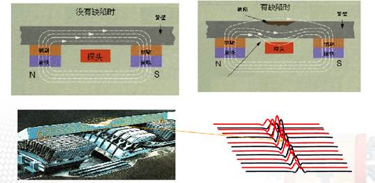 檢測器自身攜帶的磁單元將檢測器通過的局部管壁飽和磁化,在管壁的全圓周上形成磁回路。如果管內壁或外壁有缺陷,管壁內的磁力線將圍著缺陷重新分布,結果是一部分磁力線泄露出來,進入到周圍介質,這就是漏磁場。泄露的磁場被位于磁極之間的、緊貼管壁的探頭檢測到。這些信號經過濾波、放大、轉換處理后被記錄到存儲器中,檢測結束后經數(shù)據(jù)分析系統(tǒng)處理,對其進行識別和度量,工作原理如圖1所示。