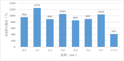 分析檢測數(shù)據(jù),發(fā)現(xiàn)該管道上共存在金屬損失6 000余處、焊縫異常信號50余處、變形點20余處,檢測數(shù)據(jù)質量優(yōu)。通過數(shù)據(jù)分析軟件,得出金屬損失里程分布柱狀圖(圖9)和金屬損失分布周向圖(圖10)。