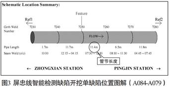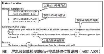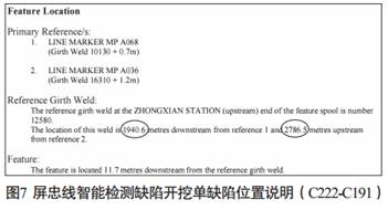 筆者以2008年8月的屏忠線檢測數(shù)據(jù)生成的一張缺陷開挖單舉例做簡單說明。 見圖1, 上游A084號馬克點在6680號環(huán)焊縫下游2.4米處, 下游A079號馬克點在7630號環(huán)焊縫下游6.1米處, 兩點間距為748.2米(495.8米+252.4米) , 上游點距離缺陷點較近的7250焊口495.8米, 下有點距離缺陷點較近的7250焊口252.4米。 那我們使用皮尺從下游點往上游點測量前進252.4米, 就是7250焊縫位置, Feature中的“0.0metres”表示缺陷與7250焊縫的距離是0米, 這說明缺陷就在焊縫上。