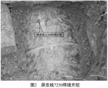 完成7250位置測量后, 垂直于水平面進行開挖, 如圖2, 發(fā)現(xiàn)焊縫。