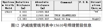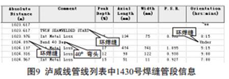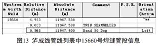 但還有更簡單的方法。 同樣以圖8所示缺陷為例, 通過PII橫向功能列表里面中的“ Pipeline”按鍵可打開管線列表(注: 管線列表主要記錄了每段管節(jié)的長度, 焊縫里程、 彎頭度數(shù)等信息) 。