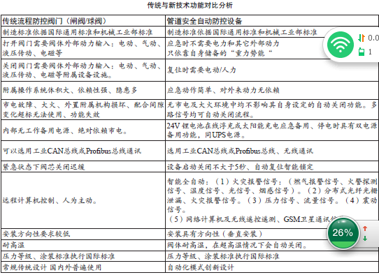 “管道安全自動防控設備”自動化程度高、使用重力作為設備應急動力,保持穩(wěn)定安全可靠、啟閉迅速。設備所屬電器遵守本安式、隔爆式設計為防爆產品。部件選擇不同材質,可適用各種介質。兼容接收各種警報信號指令、全自動響應迅速、調控準確到位。不依賴市電、液壓、氣源、蓄能器等能源。“管道安全自動防控設備”技術特性見下表。