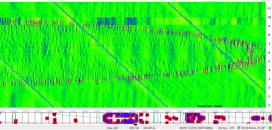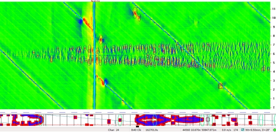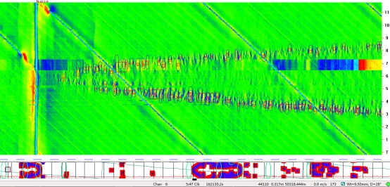 (2)位于首站出站50 890.035 m處前后,內(nèi)檢測(cè)信號(hào)顯示連續(xù)6根管節(jié)存在1 072處內(nèi)腐蝕缺陷,且缺陷的時(shí)鐘分布特征也顯示為積水腐蝕。其下游的44620-44670段6根管節(jié)44 m范圍內(nèi)也存在532處內(nèi)腐蝕缺陷,且內(nèi)腐蝕均分布在5:00~7:00時(shí)鐘范圍內(nèi)。與50 322 m處的內(nèi)腐蝕類似,該管段也呈現(xiàn)出較典型的建設(shè)期試壓水導(dǎo)致的內(nèi)腐蝕特征。內(nèi)檢測(cè)信號(hào)部分截圖如圖2所示。