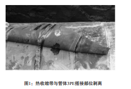 失效表現(xiàn):熱收縮帶與管體3PE防腐層搭接部位密封失效,呈現(xiàn)剝離狀態(tài)(見圖1),在熱收縮帶兩側(cè)搭接處進(jìn)行電火花檢漏時(shí)有漏電現(xiàn)象。