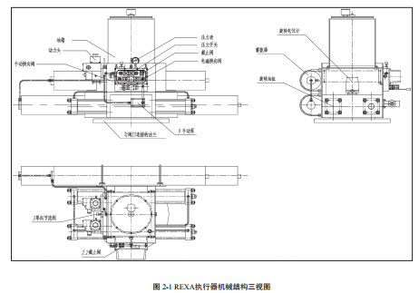 REXA執(zhí)行器是一個(gè)由三套自成體系的控制系統(tǒng)組成的有機(jī)組合體。他們分別是由壓力開(kāi)關(guān)、步進(jìn)電機(jī)及其驅(qū)動(dòng)器、油泵、蓄能器,壓力表組成的充壓控制系統(tǒng),由電磁閥、單向節(jié)流閥、蓄能器、旋轉(zhuǎn)油缸,球閥、旋轉(zhuǎn)電位計(jì)組成的開(kāi)關(guān)球閥控制系統(tǒng)(各組成單元部位機(jī)械制圖見(jiàn)圖2-1)以及手動(dòng)控制系統(tǒng)(充壓、開(kāi)關(guān))。