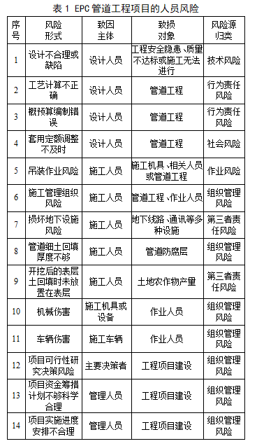 EPC管道工程項(xiàng)目涉及多方相關(guān)人員,除了數(shù)量占比較高的施工人員外,還包括工程設(shè)計(jì)人員、監(jiān)理人員及承包商管理人員等,各類(lèi)人員帶來(lái)或面臨的風(fēng)險(xiǎn)不盡相同,如表1所示。