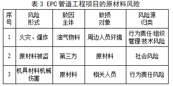 管道施工中用到的原材料包括兩類(lèi),一類(lèi)為管道試運(yùn)行階段投入的油氣物料;另一類(lèi)為施工階段用到的管材、機(jī)具配件、輔材等。油氣物料屬于易燃易爆的危險(xiǎn)化學(xué)品,機(jī)具配件、輔材等則存在被盜、機(jī)械傷害等風(fēng)險(xiǎn),如表3所示。