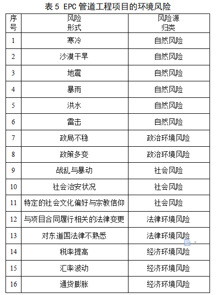海外管道工程涉及不同國(guó)家,每個(gè)國(guó)家的自然環(huán)境、社會(huì)人文、政治制度、法律監(jiān)管等千差萬(wàn)別,造成海外施工面臨多樣、復(fù)雜的環(huán)境風(fēng)險(xiǎn),如表5所示。