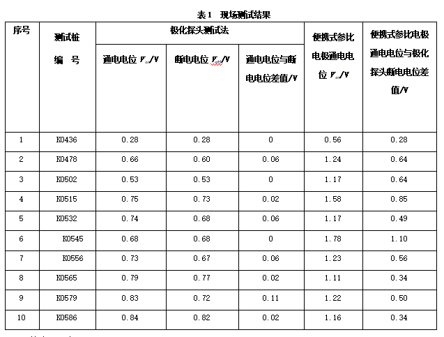 用極化探頭對(duì)西南片區(qū)某管段陰極保護(hù)效果進(jìn)行了現(xiàn)場(chǎng)測(cè)試。該管段地處城市周邊,陰極保護(hù)方式為外加強(qiáng)制電流和犧牲陽(yáng)極相結(jié)合。周圍有較多電氣化鐵路、高壓輸電塔、銅礦廠,受雜散電流的干擾比較嚴(yán)重。用極化探頭和便攜式參比電極測(cè)量的電位見表1。