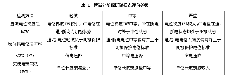 首先通過PCM + ACVG和DCVG方法對全線管道進(jìn)行埋地管道外防腐層完整性檢測,包括:防腐層整體狀況評價(jià),準(zhǔn)確定位破損點(diǎn),確定缺陷的大小和嚴(yán)重程度分類,確定缺陷的修復(fù)優(yōu)先級別,評價(jià)其完整性情況。此次305 km共檢測到242處防腐層破損點(diǎn)。其中39處為“一類”;43處為“二類”;160處為“三類”。防腐層破損點(diǎn)的評價(jià)方法根據(jù)《GB/T 19285-2014 埋地鋼質(zhì)管道腐蝕防護(hù)工程檢驗(yàn)》及《SY/T 0087.1-2006 鋼質(zhì)管道及儲罐腐蝕評價(jià)標(biāo)準(zhǔn)埋地鋼質(zhì)管道外腐蝕直接評價(jià)》,等級評價(jià)準(zhǔn)則如表1所示。