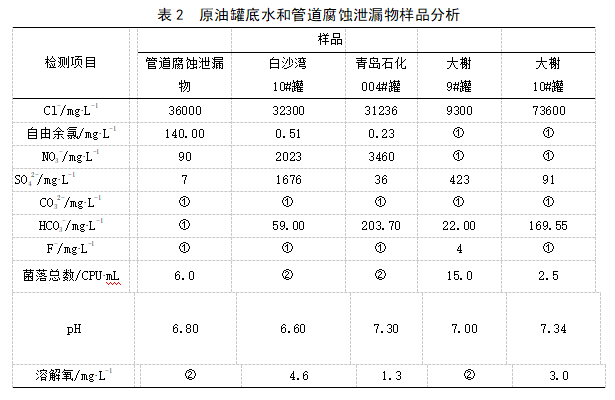經(jīng)對原油罐底水和管道腐蝕泄漏物進行樣品分析(見表2),判斷在管道輸送過程中,原油中的水溶性腐蝕雜質(zhì)向原油析出水中溶解、濃縮,形成高礦化度水,在管道中聚集,從而造成管道腐蝕。腐蝕泄漏管道初期泄漏物分析表明,管道泄漏物與罐底水類似,均為高礦化度水,其氯離子含量最高達7%(w,質(zhì)量分數(shù)),但細菌含量總體不高,可能是罐底水中的自由余氯一定程度上抑制了細菌的生長。測試還表明,罐底水中還含有一定的溶解氧,氧的存在進一步加劇了管道的腐蝕。