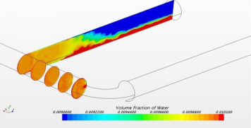 從管道中的油水兩相體積分布云圖(見圖4)可以看出,入口端管道直管段內(nèi),油中的水基本可以被油直接帶走,未出現(xiàn)明顯的油水分層現(xiàn)象。但在彎頭位置,離心力作用將水甩到管道外側(cè),使管道外側(cè)的水含量明顯增多。在盲管段,油和水發(fā)生分層,管道底部出現(xiàn)水沉積,三通管口1.5~2 m距離往后流速很低,盲管深處速度幾乎為零,水沉積現(xiàn)象更為明顯。