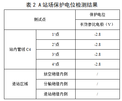 從表1、表2可以看出,進(jìn)站區(qū)域絕緣接頭內(nèi)側(cè)保護(hù)電位達(dá)不到要求,站內(nèi)區(qū)域陰保保護(hù)電位偏負(fù),遂對(duì)恒電位儀進(jìn)行了調(diào)整。調(diào)整后經(jīng)測(cè)試,恒電位儀運(yùn)行正常,站內(nèi)區(qū)域保護(hù)電位有較大正向偏移,但進(jìn)站區(qū)域絕緣接頭內(nèi)側(cè)保護(hù)電位較之前無(wú)明顯變化,達(dá)不到保護(hù)要求,而且啟/停恒電位儀,都沒(méi)有明顯變化,說(shuō)明該區(qū)域無(wú)陰保電流。當(dāng)恒電位儀控制電位為–1.8V時(shí),進(jìn)站區(qū)域處于欠保護(hù)狀態(tài),而其他區(qū)域處于過(guò)保護(hù)狀態(tài),說(shuō)明調(diào)整恒電位儀的輸出對(duì)該區(qū)域的保護(hù)沒(méi)有起到作用。