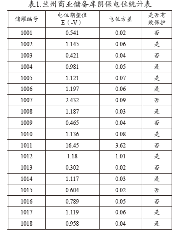 2013年3月開始對(duì)蘭州商業(yè)儲(chǔ)備庫陰極保護(hù)進(jìn)行電位測試,經(jīng)過對(duì)蘭州商業(yè)儲(chǔ)備庫18具儲(chǔ)罐的18套陰極保護(hù)系統(tǒng)電位統(tǒng)計(jì),參照標(biāo)準(zhǔn)陰保電位保護(hù)為負(fù)0.85至負(fù)1.2伏之間,也有標(biāo)準(zhǔn)規(guī)定最負(fù)電位負(fù)1.5伏的,經(jīng)過統(tǒng)計(jì)發(fā)現(xiàn)有8座儲(chǔ)罐陰保電位期望值不達(dá)標(biāo),整體陰極保護(hù)率只有55.56%。其中1011#儲(chǔ)罐3至8月陰極保護(hù)電位期望值達(dá)到負(fù)16.45伏,方差3.62,保護(hù)電位波動(dòng)明顯,保護(hù)效果極差。2013年3月至8月蘭州商業(yè)儲(chǔ)備庫陰保電位統(tǒng)計(jì)見表1。