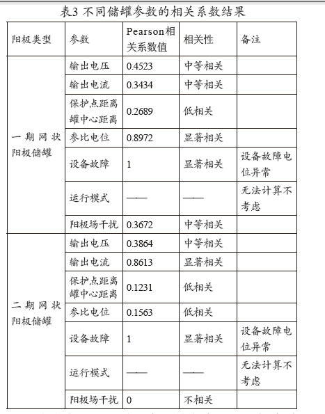 因儲(chǔ)備庫陰保系統(tǒng)陽極分成深井陽極和網(wǎng)狀陽極陰保系統(tǒng),我們將相關(guān)性分析按照兩組進(jìn)行,根據(jù)各個(gè)參數(shù)分別計(jì)算Pearson相關(guān)系數(shù),結(jié)果見表3。