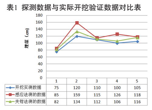 通過(guò)實(shí)際開挖驗(yàn)證,我們可以分析探測(cè)儀探測(cè)數(shù)據(jù)與實(shí)際埋深間的誤差。下面以武漢光纜支線中洲大橋段的5處測(cè)量點(diǎn)的數(shù)據(jù)進(jìn)行分析。如圖9、表1所示。
