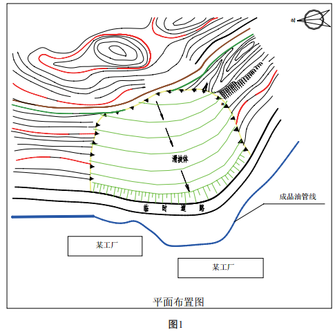 廣東順德某成品油管道繞飛鵝山腳呈等高線敷設(shè)。 2008年6月30日, 由于受連續(xù)多天強(qiáng)降雨的惡劣天氣影響, 山腰出現(xiàn)多處裂縫, 裂縫的寬度和數(shù)量不斷擴(kuò)大和增多, 山腳已開始形成小面積的滑坡。 管道前方的廠房建筑物出現(xiàn)大面積開裂和倒塌。 經(jīng)初步測(cè)量, 滑坡體積約為3萬立方, 滑坡面處于管道上方約12米的位置, 滑坡體腳址位于管道前20米位置, 若不快速采取有效措施, 滑坡體下滑的外力將加劇對(duì)成品油管道的推移,導(dǎo)致管道變形、 斷裂和成品油大量泄漏, 危及周圍群眾生命財(cái)產(chǎn)安全, 破壞周邊的生態(tài)環(huán)境。 (見圖 1)