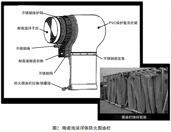防火圍油欄用于水域控制溢油擴散和轉移,特別是溢油控制燃燒處理、 攔截、 防止火勢蔓延等作業(yè)中有著不可替代的作用。 它由浮體、 裙體、 快速接頭三大部分組成, 浮體一般有不銹鋼浮體和陶瓷泡沫浮體, 具有阻燃防火功能; 裙體部分采用高強度PVC布縫制而成, 具有阻擋溢油從圍油欄下通過的作用; 快速接頭部分使圍油欄單體之間連接簡捷、 迅速。 不銹鋼浮體防火圍油欄見圖1, 陶瓷泡沫浮體防火圍油欄結構見圖2。
