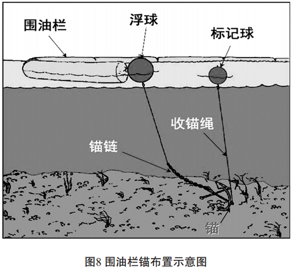 在河流中布放圍油欄, 為了確保圍油欄保持理想的角度, 需要使用錨來固定圍油欄, 見圖8。具體需要使用多少錨, 可以根據圍油欄的長度、欄裙高度、 圍油欄和水流之間的相對速度及錨的種類來計算。