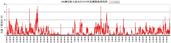 (5)由圖2可以看出,各測試點交流干擾電壓24 h平均值均小于4 V,但部分測試點的峰值電壓較高,最高達到28 V。按照國家標準GB/T 50698的規(guī)定,平均交流干擾電壓小于4 V,可不采取防護措施,但因峰值電壓較高,仍可能威脅現(xiàn)場管道操作人員的安全。
