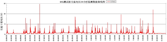 (2)045測試點距離鐵路較近,僅52 m。現(xiàn)場測量發(fā)現(xiàn),電力機車通過該測試點附近時,垂直于管道向鐵軌方向20 m處測得的最大交流電位梯度達35 V。由圖3中的24 h交流干擾曲線圖也可發(fā)現(xiàn),當電力機車通過時,管道交流干擾電壓瞬間達到峰值;當電力機車遠離后,管道交流干擾電壓瞬間回落。這表明電阻性耦合是電氣化鐵路對045測試點產(chǎn)生交流干擾的主要原因。