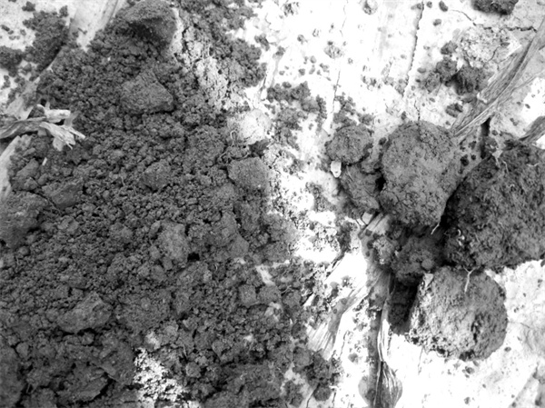②臨澤縣沙河鎮(zhèn)化音村管道穿越的一農(nóng)戶農(nóng)田,管道上方耕作層的土壤為黑灰色泥炭狀土,無團(tuán)粒結(jié)構(gòu), 粘接成塊(圖2);同一地塊非管道上方的耕作層土壤雖也有摻雜的黑色泥炭土,但土質(zhì)松軟、團(tuán)粒結(jié)構(gòu)良好。