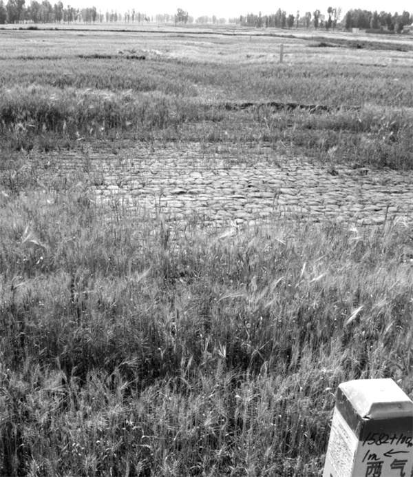 甘州區(qū)堿灘鄉(xiāng)三壩村一社管道穿越農(nóng)田上方的土壤剖面顯示,地表20cm以下出現(xiàn)石粒、砂粒和粘土的混合層, 此層硬實度較高,鐵鍬難以下挖;而在非管道上方的土壤剖面顯示,地表以下0~40cm內(nèi)沒有發(fā)現(xiàn)砂石粒層。