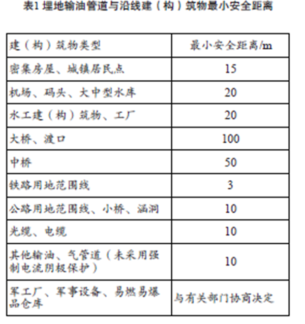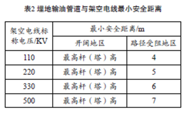 油氣管道沿線難免會(huì)有鐵路、公路、房屋等建(構(gòu))筑物,不同類型的建(構(gòu))筑物與管道的最小安全距離不同,相關(guān)標(biāo)準(zhǔn)除上述提到的兩項(xiàng)之外,還包括:《埋地鋼質(zhì)管道陰極保護(hù)技術(shù)規(guī)范GB/T 21448—2008》《鋼質(zhì)管道外腐蝕控制規(guī)范GB/T 21447—2008》《關(guān)于處理石油管道和天然氣管道與公路相互關(guān)系的若干規(guī)定(試行) 》《原油、天然氣長(zhǎng)輸管道與鐵路相互關(guān)系的若干規(guī)定》《110~500kV 架空送電線路設(shè)計(jì)技術(shù)規(guī)程》(DL/T 5092—1999)。埋地原油、成品油管道與沿線建 (構(gòu))筑物安全距離如表1所示,管道與沿線高壓電力線安全距離如表 2 所示,敷設(shè)在地面的輸油管道與沿線建(構(gòu))筑物安全距離應(yīng)按表 1、表 2所示加倍。