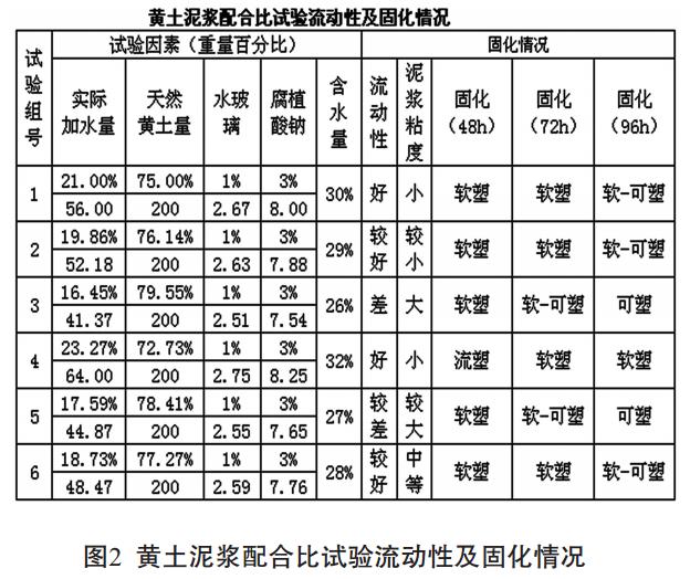 流動試驗和固結試驗結果表明, 當黃土泥漿含水量不超過27%時, 泥漿流動性較差, 基本不能流動或流動緩慢, 無法滿足對斜井灌注要求。當黃土泥漿含水量大于30%時, 泥漿流動性好,但在固結過程中析出的水較多, 固結時間較長。而介于前兩者之間的泥漿流動性較好, 固結過程中析水較少, 固結4天(96小時) 后具有一定強度。 也就是說, 含水量28~30%的黃土泥漿流動性及固化效果均較好, 能夠滿足斜井灌注要求。黃土泥漿的配合比建議值: 黃土68%、 水28%、水玻璃1%、 腐植酸鈉3%。