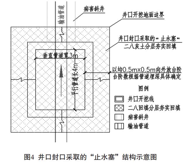 關鍵工序一: 斜井上、 下井口的開挖按0.5m×0.5m臺階形式從地面向下開挖, 使斜井井口下口順管道方向長4m, 垂直管道方向長3m。斜井井口地面開挖尺寸根據(jù)管道具體埋深確定,開挖深度至管底0.5m為準。 確保井口采用二八灰土分層夯填形成的“止水塞”能完全封堵斜井井口, 有效攔截地表水及順管溝的潛流。
