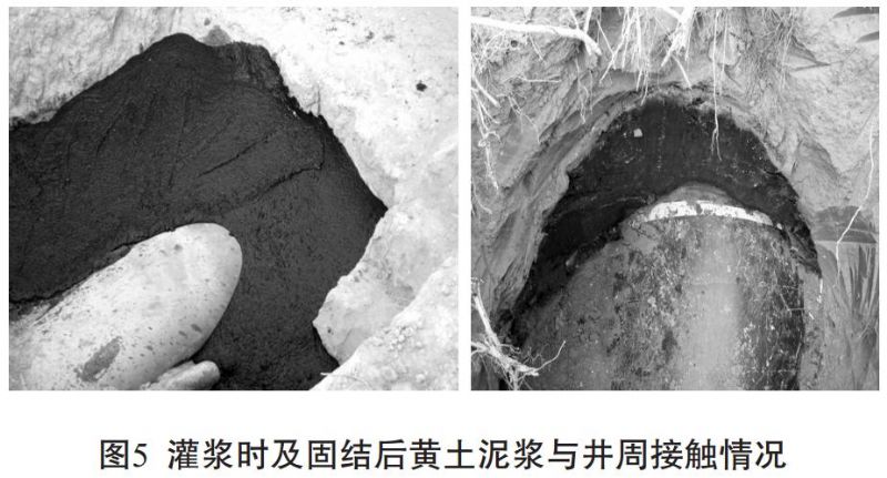 試點斜井施工完兩個月后挖開試點斜井下井口檢查黃土泥漿與管道、 井壁黃土接觸情況, 發(fā)現(xiàn)斜井內部黃土泥漿充填密實, 與四周的斜井井壁及管道均接合良好, 未發(fā)現(xiàn)有收縮縫存在, 同時泥漿并未完全固化, 略具彈性, 呈硬塑狀。 說明黃土泥漿在斜井內部的固化時間相對較長。 造成這種現(xiàn)象的原因主要是因為斜井內部空間為密封狀態(tài), 黃土泥漿在固結過程中析出的水分完全依靠斜井四周土體自然吸收, 當土體吸收的水分達到一定程度時, 其吸水能力便會減弱, 同時密封空間內的溫度較低, 黃土泥漿的固化時間便進一步延長。 可以推測, 隨著時間的增長, 管道周圍的黃土泥漿強度會逐漸增大, 管道的穩(wěn)定性得到了極大的保證。