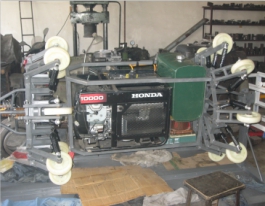 依托伊霍線等新建管道工程研制的自源主動(dòng)運(yùn)動(dòng)智能牽引系統(tǒng),成功解決了內(nèi)檢測(cè)器的動(dòng)力源問(wèn)題。該自源主動(dòng)運(yùn)行智能牽引系統(tǒng)由輪式管道行走動(dòng)力機(jī)械結(jié)構(gòu)和自動(dòng)控制系統(tǒng)組成,其中輪式管道行走動(dòng)力機(jī)械結(jié)構(gòu)由超輕車(chē)身、八輪行進(jìn)結(jié)構(gòu)、燃油系統(tǒng)支撐結(jié)構(gòu)、電機(jī)電瓶系統(tǒng)支撐結(jié)構(gòu)等組成,自動(dòng)控制系統(tǒng)由汽油發(fā)電機(jī)控制系統(tǒng)、速度控制系統(tǒng)和供電監(jiān)測(cè)系統(tǒng)等組成。依托于該自源主動(dòng)運(yùn)行智能牽引系統(tǒng),成功開(kāi)展了牽引力試驗(yàn)、爬坡能力試驗(yàn)(下坡速度控制在1.2 m/s以下)、彎頭能力試驗(yàn)和工作壽命試驗(yàn)等,實(shí)現(xiàn)了我國(guó)首次空管變徑、弱磁內(nèi)檢測(cè)。
